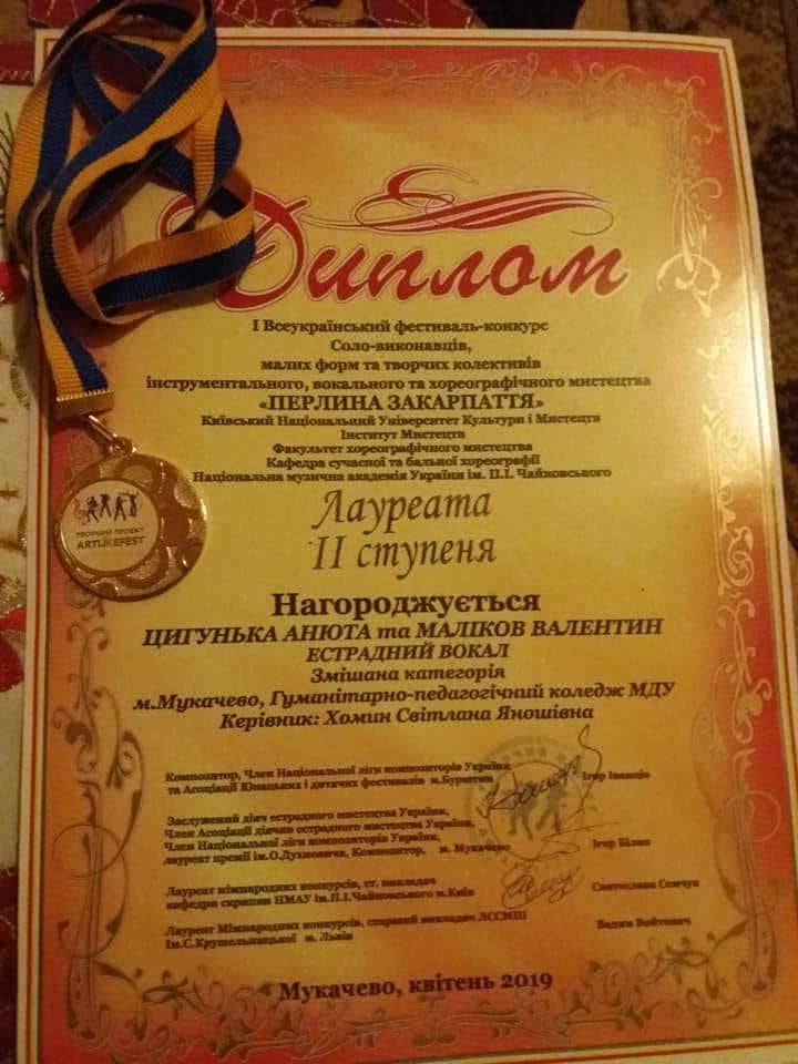 Лауреатів ІІ ступеня – дует естрадний вокал (змішана категорія) – Цигунька Анюта та Маліков Валентин