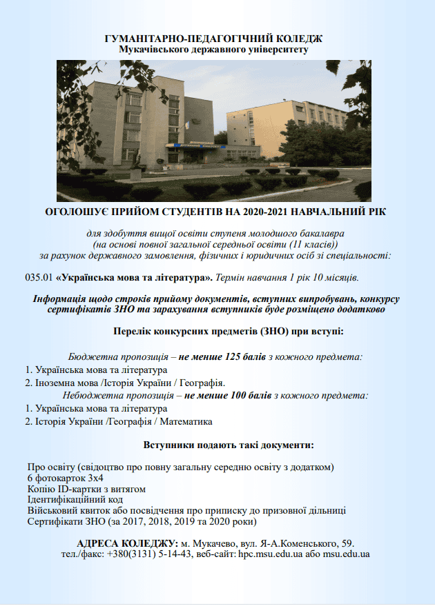 • ГПК МДУ (Відокремлений структурний підрозділ «Гуманітарно-педагогічний фаховий коледж Мукачівського державного університету»)  у 2020/2021 оголошує вперше прийом на навчання на здобуття ступеня вищої освіти «молодший бакалавр», у тому числі, за державним замовленням. Ступінь молодшого бакалавра – новий освітній продукт у системі вищої освіти України. Ви отримаєте унікальну можливість на основі повної загальної середньої освіти отримати ступень вищої освіти «молодший бакалавр» зі спеціальності 035 «Філологія».