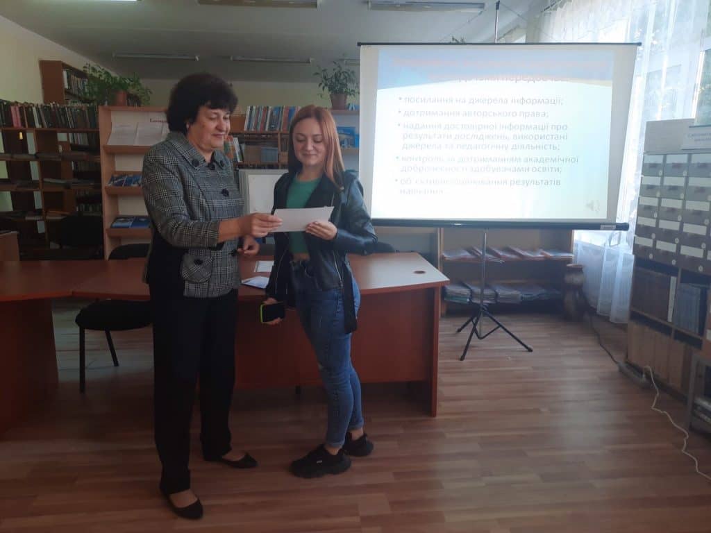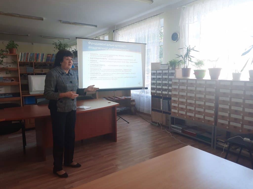 6–7 жовтня 2020 року у читальній залі бібліотеки відбулися курси «Академічна доброчесність в сучасному освітньому просторі». Модератор заходу – завідувач бібліотекою ВСП «ГПФК МДУ» Абельчакова Н.І.привітала учасників, зазначивши, що академічна доброчесність є необхідною як для забезпечення якості освіти, так і для кожної людини, яка хоче досягнути успіхів у своїй праці.