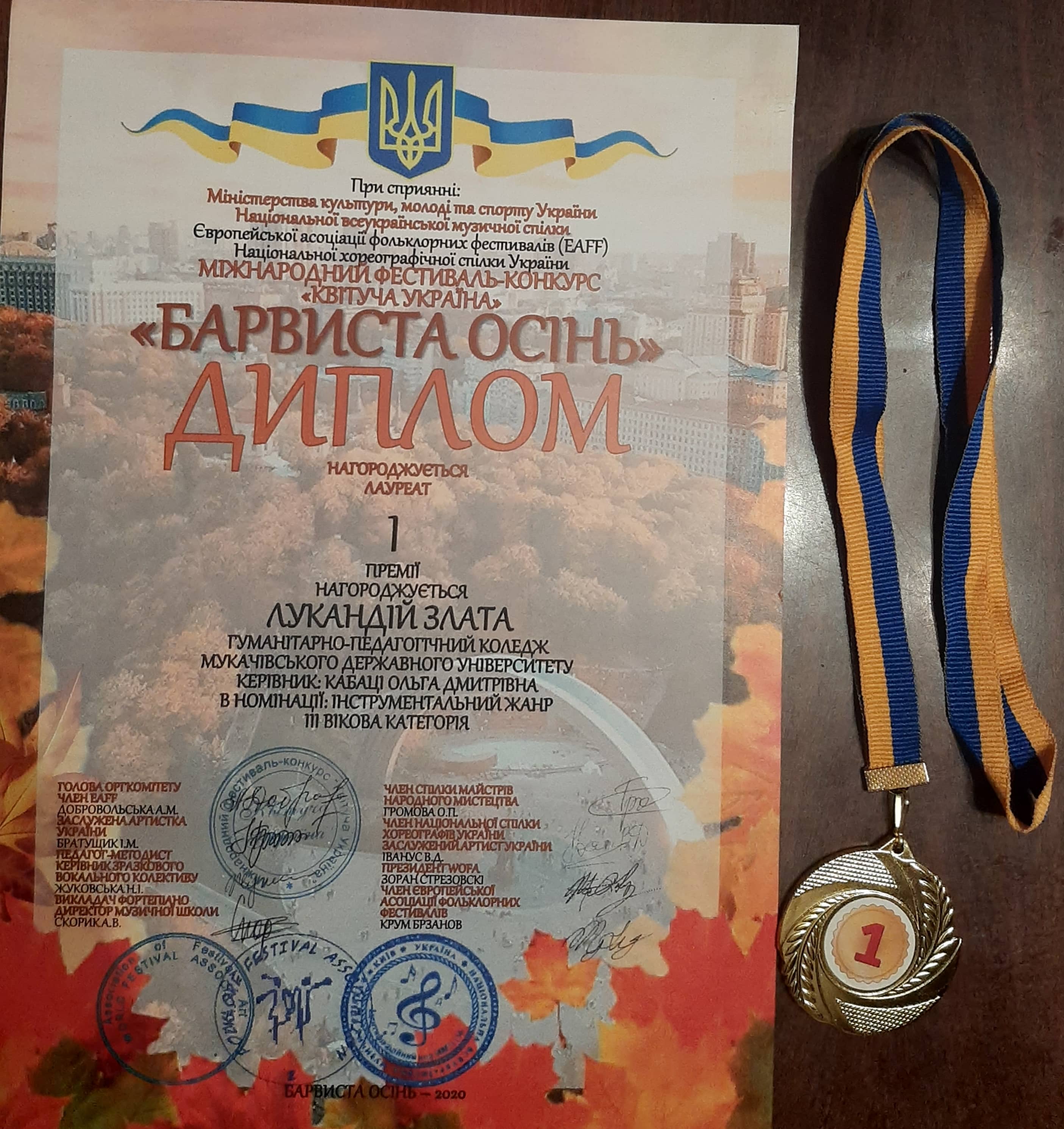 Знову студентка музичного відділення  Лукандій Злата здобула перемогу в  Міжнародному фестиваль-конкурсі «Квітуча Україна» «Барвиста осінь» в номінації інструментальний жанр (фортепіано), який проходив у Києві. Адміністрація та педагогічний колектив ГПФК МДУ вітає Лукандій Злату, лауреата І ступеня з перемогою, особлива подяка викладачу основного інструменту (фортепіано) Кабаці О.Д.  за професійну майстерність та педагогічний талант у  підготовці до конкурсу. Бажаємо подальших успіхів, великих перемог!