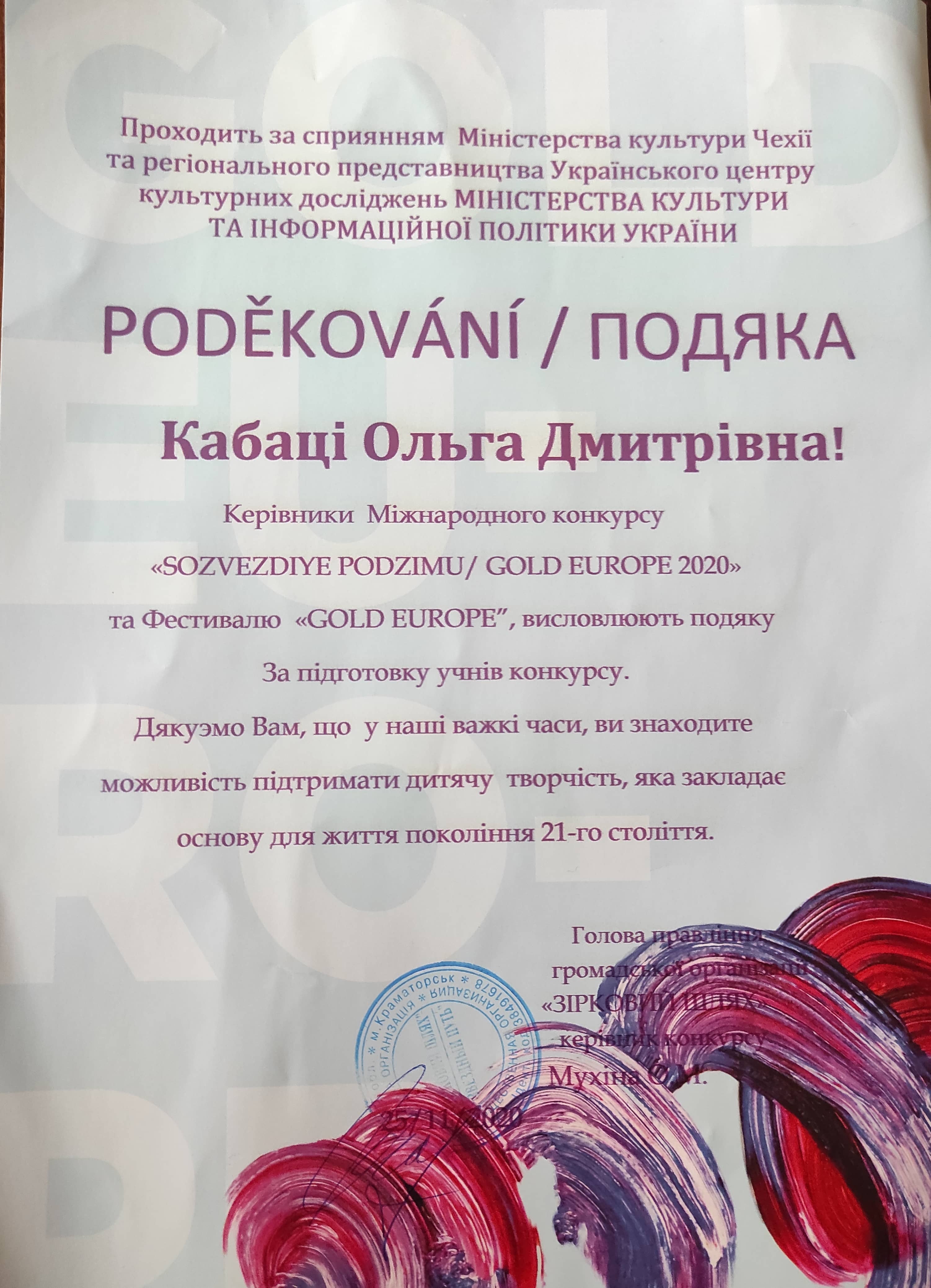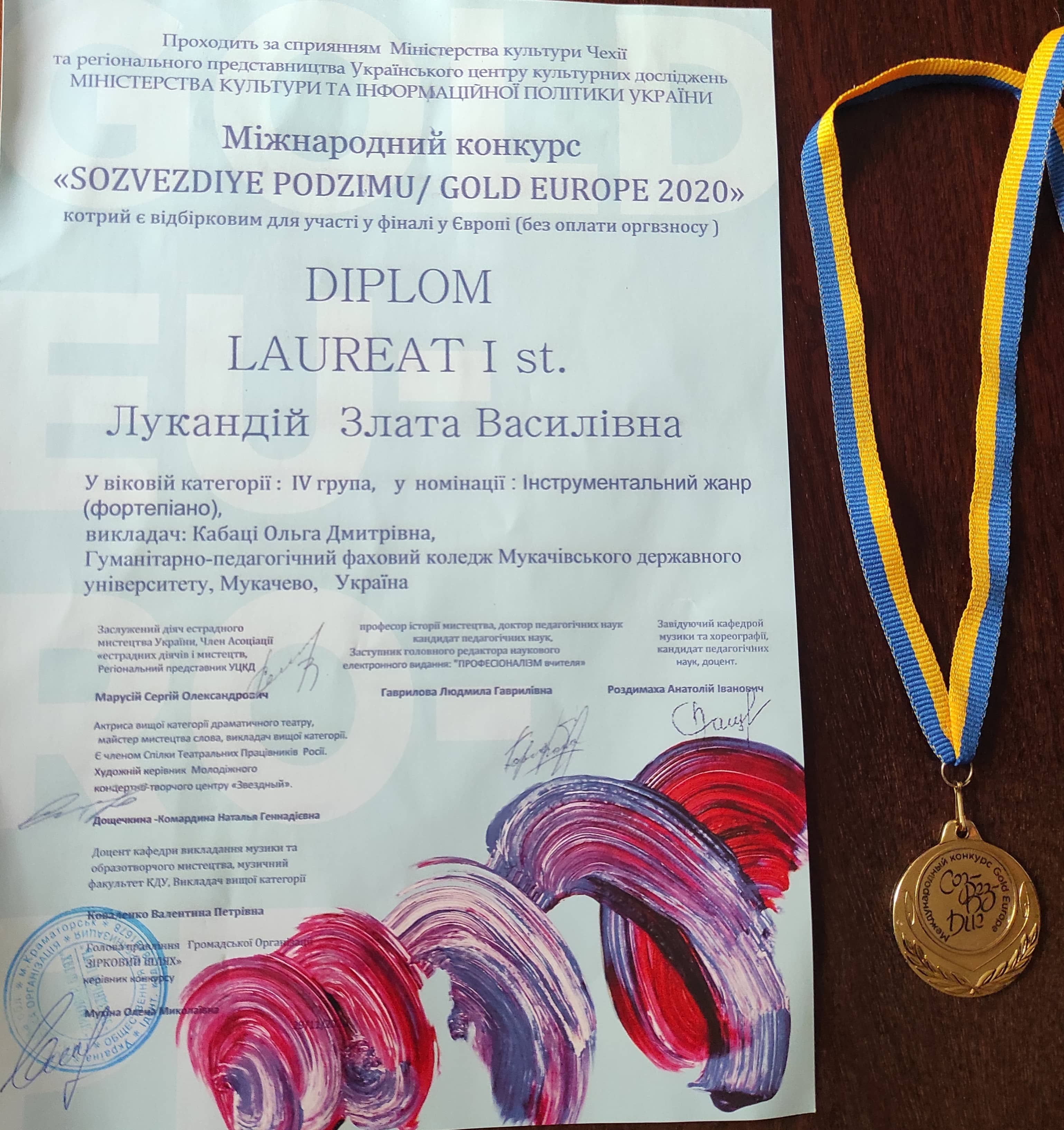 Адміністрація та педагогічний колектив гуманітарно-педагогічного фахового коледжу  МДУ вітає студентку музичного відділення Лукандій Злату з отриманою черговою перемогою на Міжнародному конкурсі «Сузір’я Святогір’я»/ «GOLD EUROPE 2020» Лауреата І ступеня  в номінації «Інструментальний жанр (фортепіано)» .