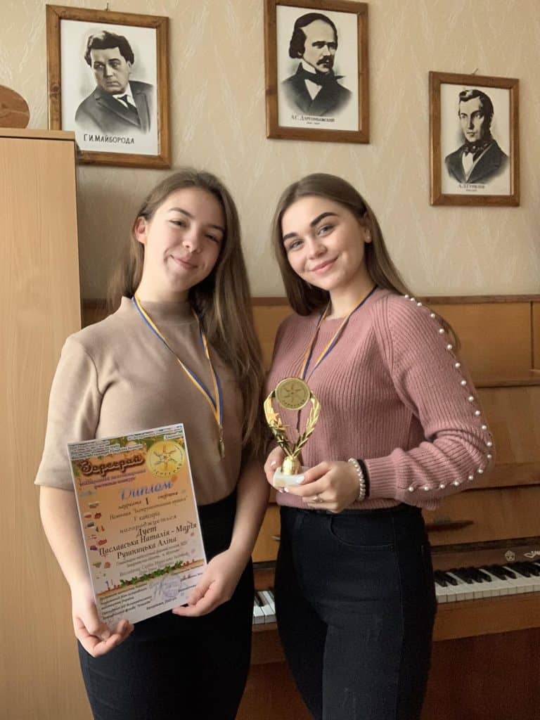 Звання Лауреатів І ступеня отримали студентки фортепіанного дуету Рушницька Аліна та Паславська Наталія-Марія у номінації «Інструментальна музика. Фортепіано. Дует»! Тож вітаємо наших піаністів та їх викладачів – Дуду Ірину Тиборівну та Сербін Мирославу Іванівну з черговою перемогою, побажаємо подальших творчих успіхів і перемог!