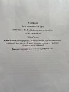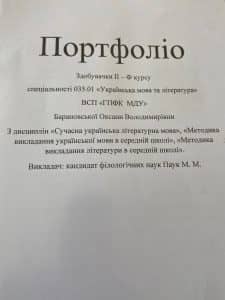 На заняттях здобувачі освіти презентують свої власні «досьє» – портфоліо, запропоноване викладачем дисциплін «Методика викладання української мови та літератури в середній школі», «Сучасна українська літературна мова», кандидатом філологічних наук Паук М.М. У портфоліо здобувачі освіти виконують теоретичні та практичні завдання: диференційовані завдання у вигляді рефератів, есе, кейсів, розроблених проєктів з питань: