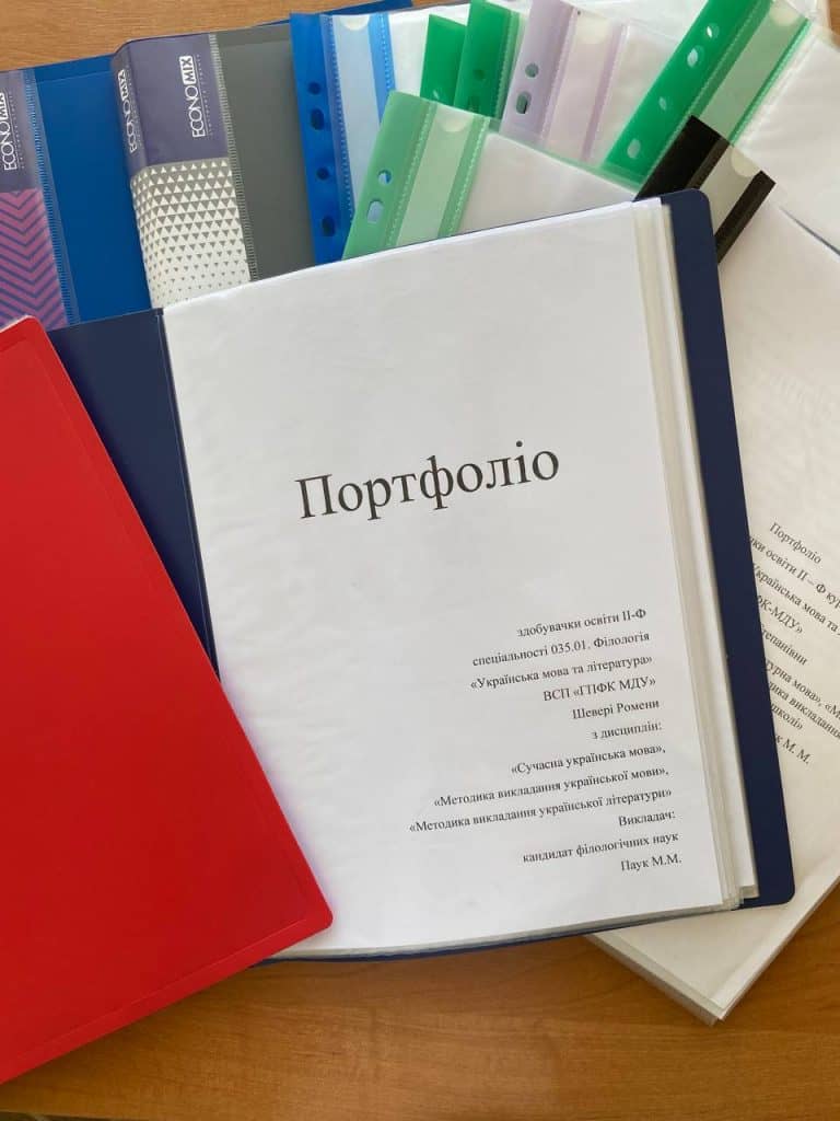 На заняттях здобувачі освіти презентують свої власні «досьє» – портфоліо, запропоноване викладачем дисциплін «Методика викладання української мови та літератури в середній школі», «Сучасна українська літературна мова», кандидатом філологічних наук Паук М.М. У портфоліо здобувачі освіти виконують теоретичні та практичні завдання: диференційовані завдання у вигляді рефератів, есе, кейсів, розроблених проєктів з питань: