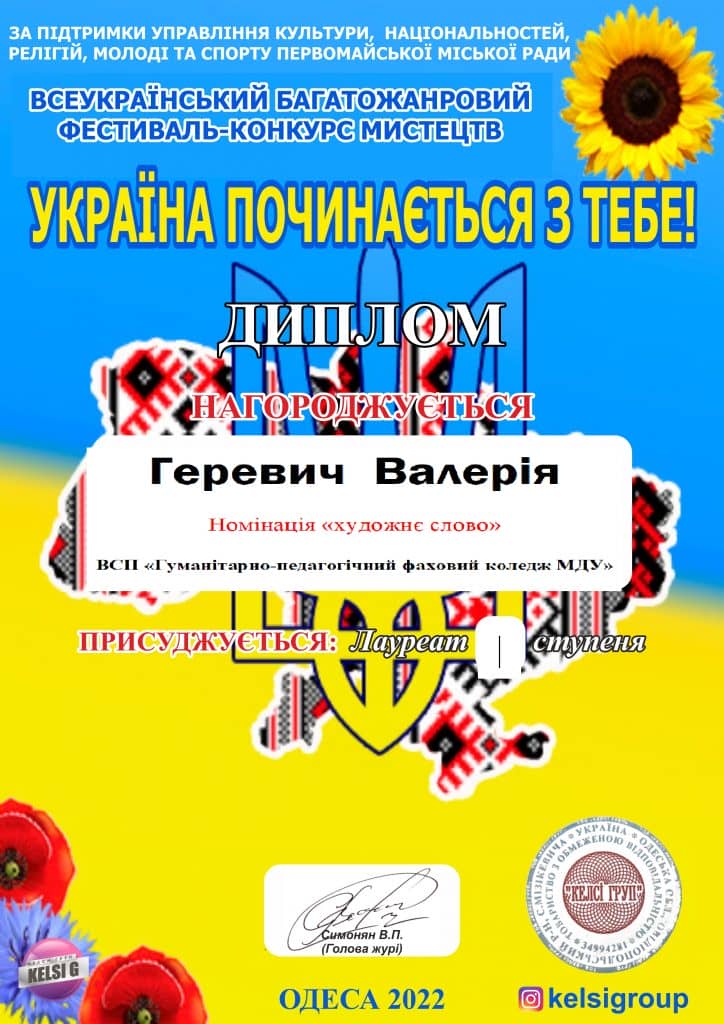 Лауреата І ступеня Всеукраїнського багатожанрового фестиваль-конкурсу мистецтв «Україна починається з тебе» в номінації художнє слово Геревич Валерію здобувачку освіти І курсу музичного відділення з перемогою!