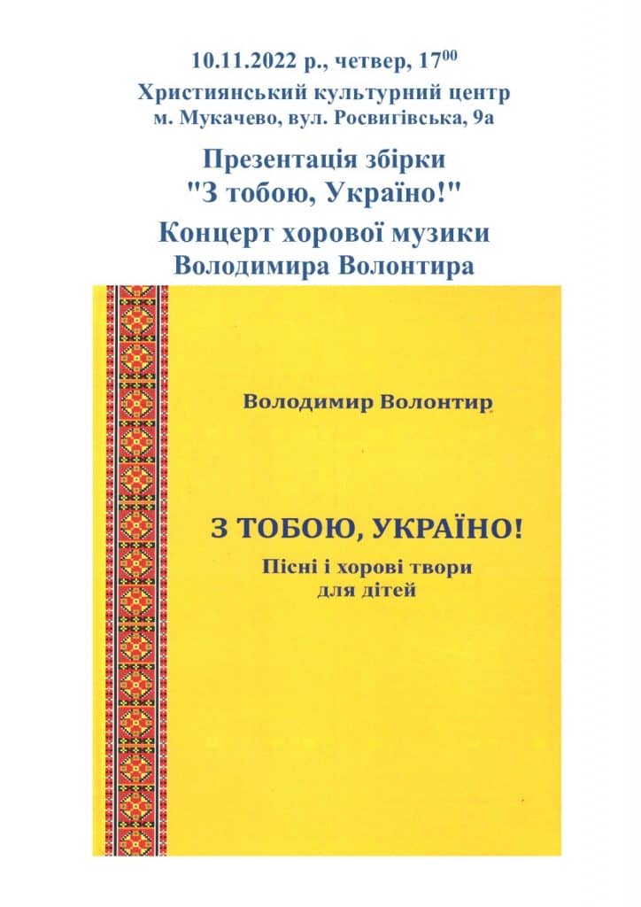10 листопада 2022 року здобувачі освіти 2 та 3 курсів (керівник академічної групи – Остап’юк Л.М.) музичного відділення ВСП «ГПФКМДУ» відвідали концерт хору хлопчиків та юнаків Мукачівської хорової школи присвячений презентації авторського збірника пісень та хорових творів Володимира Волонтира « З тобою, Україно».