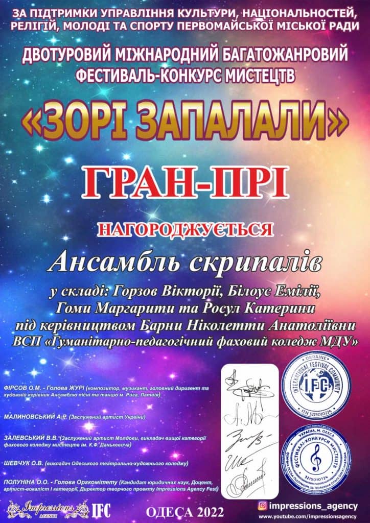 Ансамбль скрипалів у складі: Білоус Емілії, Гоми Маргарети, Горзов Вікторії та Росул Катерини здобувачів освіти музичного відділення під керівництвом Барни Ніколетти Анатоліївни з здобуттям премії ГРАН-ПРІ на Міжнародному багатожанровому фестиваль-конкурсі мистецтв «ЗОРІ ЗАПАЛАЛИ» м. Одеса в номінації інструментальний жанр.