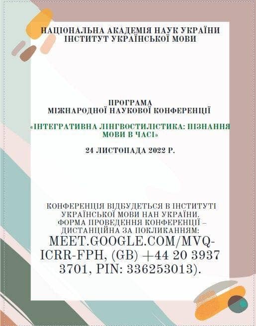 Конференція відбудеться в Інституті української мови НАН України. Форма проведення конференції – дистанційна за покликанням: meet.google.com/mvq-icrr-fph, (GB) +44 20 3937 3701, PIN: 336253013).