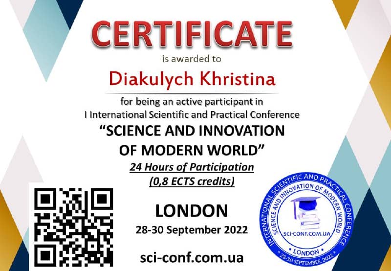 - Дякулич Христина, 2-ф курс, for being an active participant in international Scientific and Practical Conference «Science and innovation of modern worlds», London, 28-30 September 2022.