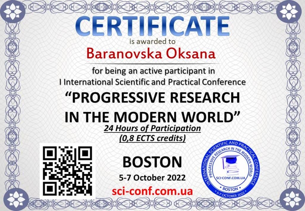 - Барановська Оксана, 2-Ф курс, for being an active participant in international Scientific and Practical Conference «Рrogressive research in the modern world», Boston, 5-7 October 2022.
