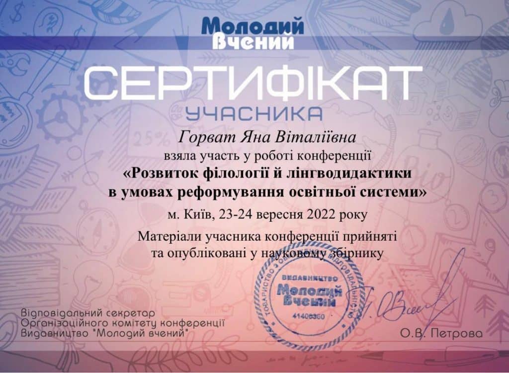- Горват Яна, 1-Ф курс, «Розвиток філології й лінгводидактики в умовах реформування освітньої системи», 23-24 вересня 2022 р., м.Київ.