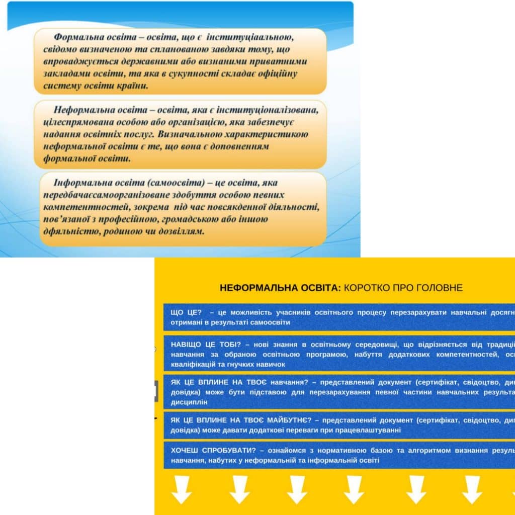 02 лютого 2023 року для здобувачів ІІ курсу спеціальності 035 Філологія керівником академічної групи Юлією Старовою була проведена бесіда на тему «Неформальна та інформальна освіта», під час якої представлено етапи та зміст неформальна та інформальна освіти, її види та особливості. Акцентовано увагу, що основні засади визнання результатів навчання здобувачів коледжу, отримані у неформальній освіті, сформульовані у Положенні про порядок визнання результатів навчання отриманих у неформальній та інформальній освіті у ВСП «Гуманітарно-педагогічний фаховий коледж МДУ». Раціональне застосування неформальної/інформальної освіти є корисним для здобувачів освіти, оскільки тут виникає можливість самовдосконалення та виховання самооцінки; розвиток громадянських навичок; оптимальне поєднання свободи і відповідальності; можливість самостійного вибору часу, місця, тривалості навчання. Під час бесіди керівник академічної групи ознайомила з можливостями неформальної/інформальної освіти, звернула увагу здобувачів освіти на той факт, що в коледжі неформальні та формальні види освіти перебувають у тісному зв’язку. Формальна та неформальна/інформальна освіта є двома незамінними явищами різнобічної освіти. Усі учасники освітнього процесу мають змогу здобути неформальну та інформальну освіту, а отримані при цьому результати навчання можуть бути перезараховані під час навчання в коледжі. Розглянуті рекомендовані посилання на онлайн-навчання, які допоможуть здобути нові знання у неформальній/інформальній освіті.