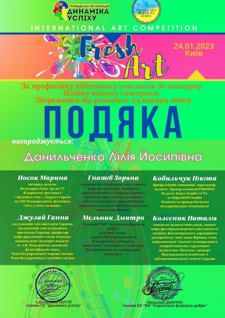 Вітаємо з перемогою Лауреатів ГРАН-ПРІ МІЖНАРОДНОГО КОНКУРСУ МИСТЕЦТВ INTERNATIONAL UKRAINIAN-CANADIAN ART COMPETITION «FRESH ART» в номінації « Вокал » викладачів Ковалюк Вероніку Михайлівну та Данильченко Лілію Йосипівну! Бажаємо творчих успіхів!