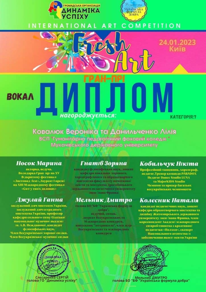 Вітаємо з перемогою Лауреатів ГРАН-ПРІ МІЖНАРОДНОГО КОНКУРСУ МИСТЕЦТВ INTERNATIONAL UKRAINIAN-CANADIAN ART COMPETITION «FRESH ART» в номінації « Вокал » викладачів Ковалюк Вероніку Михайлівну та Данильченко Лілію Йосипівну! Бажаємо творчих успіхів!
