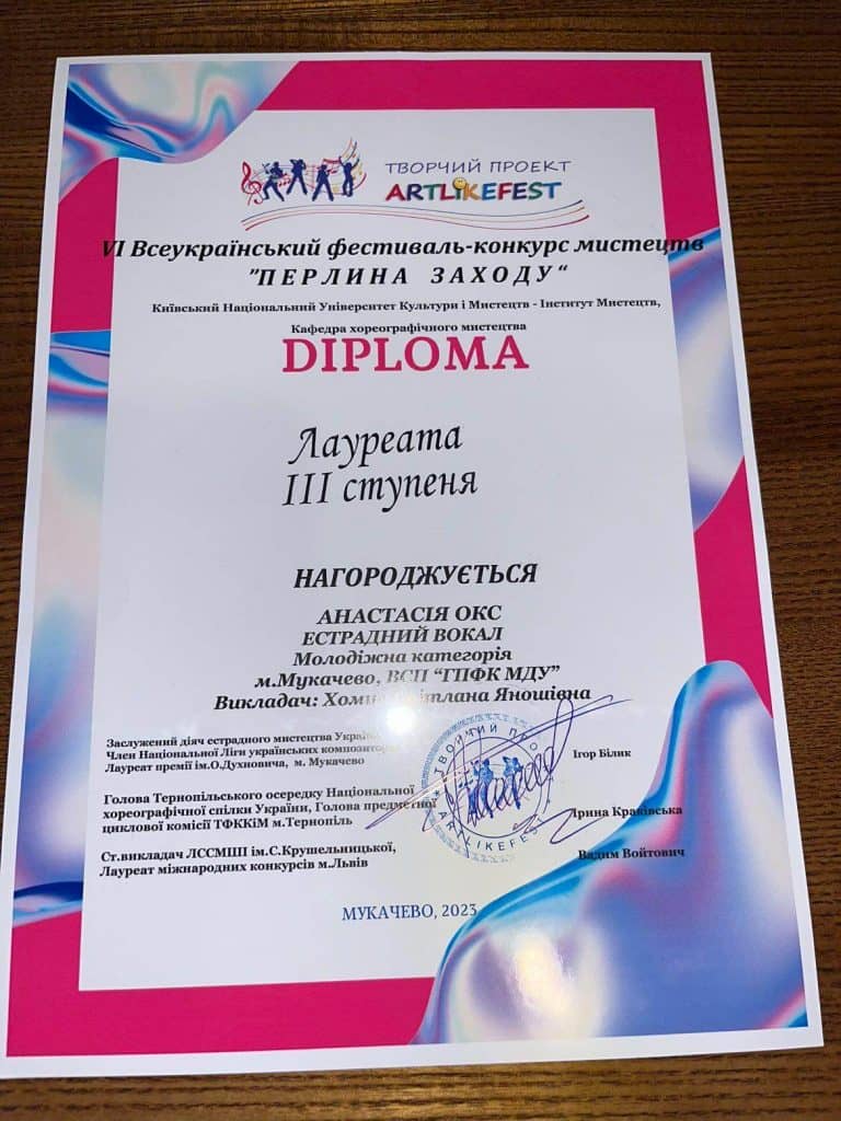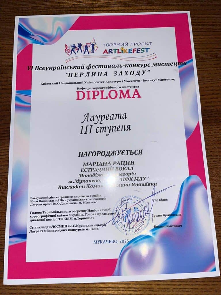 У Мукачеві на сцені Палацу культури і мистецтв відбувся VI Всеукраїнський фестиваль-форум конкурс мистецтв «ПЕРЛИНА ЗАХОДУ» від творчого проекту «ARLLIKE FESТ», у якому студенти музичного відділення ВСП «ГПФК МДУ» здобули 3 призові місця.
