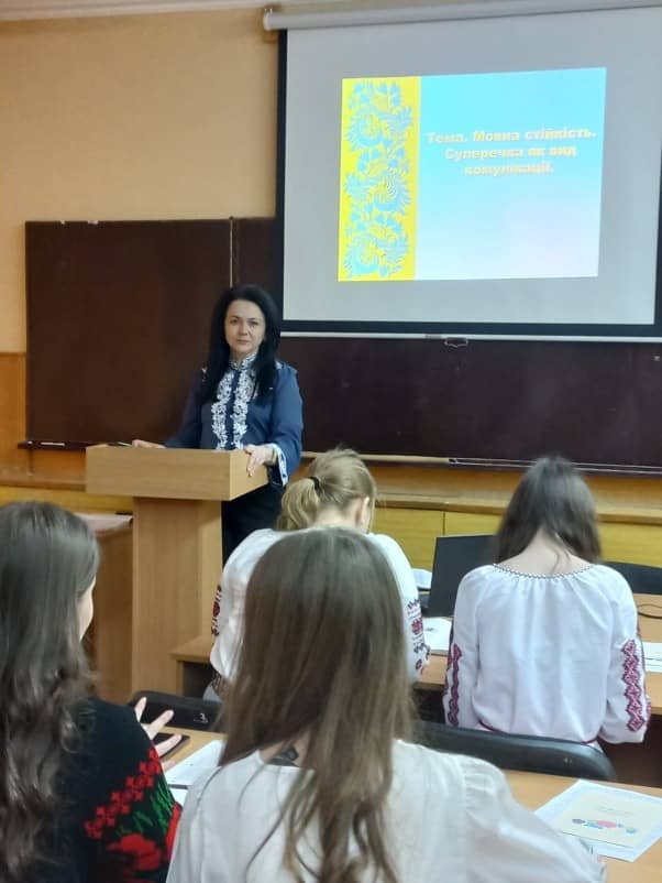 У процесі реалізації мети заняття здобувачі освіти ознайомилися з ключовими поняттями теми, а саме: «національно мовна особистість», «мовна стійкість», «суперечка», проаналізували стан сучасної мовної стійкості українців через призму історичних та сучасних подій у державі, а також охарактеризували джерела, що її живлять, виокремили різновиди суперечки та опрацювали правила її ведення. Для майбутніх учителів важливо вміти комунікативно доцільно й виправдано користуватися засобами мови в конкретних ситуаціях і сферах спілкування з дотриманням норм української мови, на що звертала увагу викладачка у процесі роботи, залучаючи студентів до комунікації та аналізу мовного матеріалу, мотивуючи їх до свідомого прагнення вивчати рідну мову. Лекцію доповнював відповідний презентаційний супровід, що надав змогу застосувати прийоми показу, розповіді, пояснення, коментування і зберегти увагу слухачів упродовж заняття.