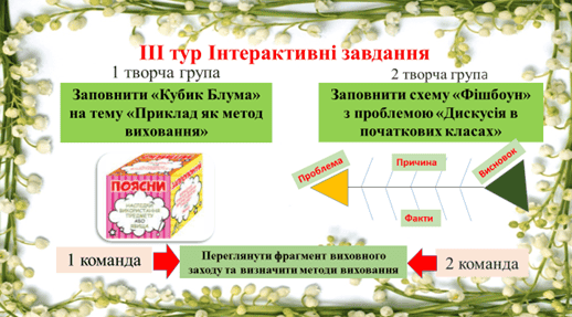 Під час педагогічного міні брейн-рингу здобувачки освіти Яворська Юлія та Довганюк Валерія представили інтерактивне завдання творчих груп: заповнити «Кубик Блума» на тему «Приклад як метод виховання» та схему «Фішбоун» з проблемою «Дискусія в початкових класах»: