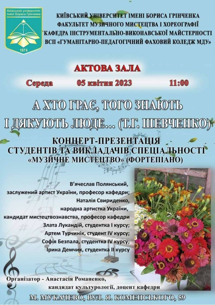 5 квітня 2023 року в актовій залі ВСП «Гуманітарно-педагогічний фаховий коледж МДУ» відбувся концерт-презентація «А хто грає, того знають і дякують люде… (Т.Г.Шевченко)» організований студентами та викладачами кафедри інструментально-виконавської майстерності факультету музичного мистецтва і хореографії Київського університету імені Бориса Грінченка. Здобувачі освіти та викладачі музичного відділення отримали творчу насолоду від виконання творів фортепіанної музики студентами спеціальності «Музичне мистецтво» (фортепіано), серед яких була і наша випускниця, а на даний час студентка Київського університету імені Бориса Грінченка Злата Лукандій. Дякуємо за незабутні враження від концерту, подарованого студентами Анастасії Романенко, кандидата культурології, доцента, Наталії Свириденко, народної артистки України, кандидата мистецтвознавства, професорки кафедри інструментально-виконавської майстерності та В’ячеславу Полянському, заслуженому артисту України, професору кафедри інструментально-виконавської майстерності.