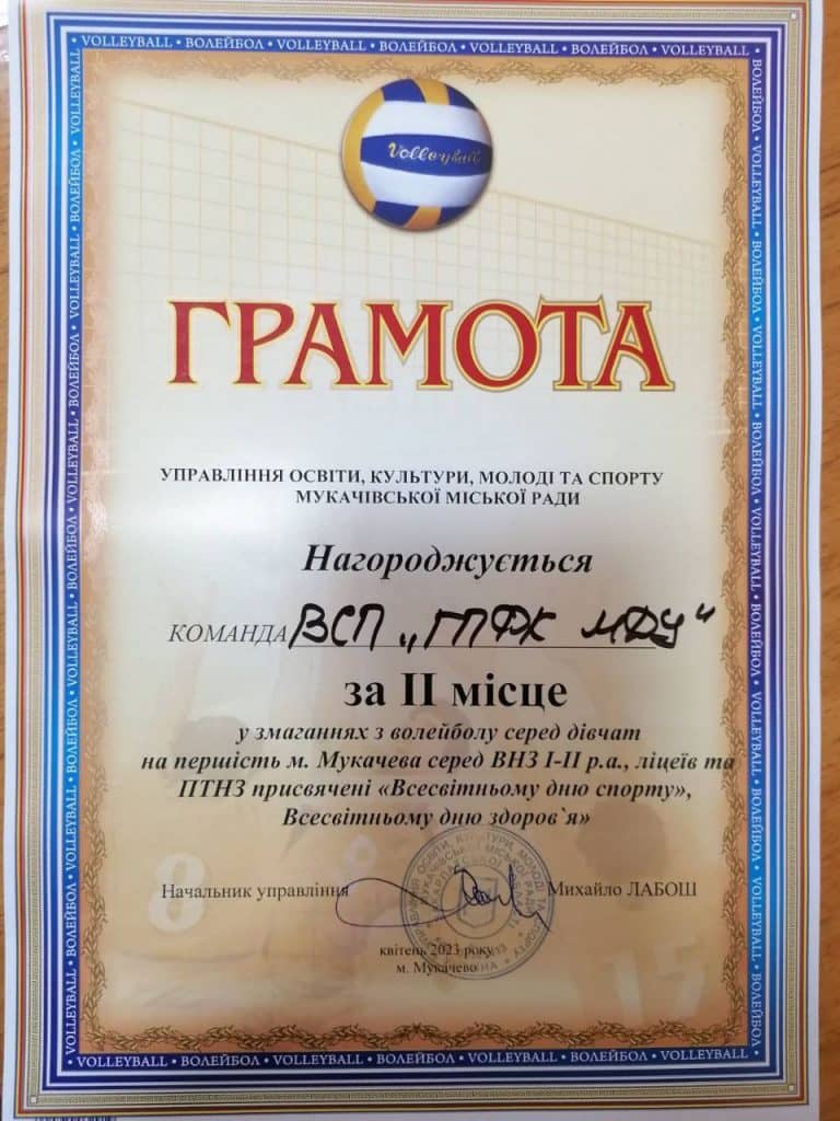 Команда ВСП «ГПФК МДУ» виборола ІІ місце у змаганнях із волейболу серед дівчат на першість Мукачева серед ВНЗ І-ІІ р.а., ліцеїв та ПТНЗ, присвячених Всесвітньому дню спорту та Всесвітньому дню здоров’я.