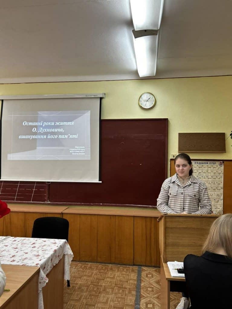 Здобувачі освіти підготували цікаві, змістовні виступи-презентації: «Життя і біографія О.Духновича» (Паньканинець Тетяна), «Літературно-просвітницька діяльність» (Дудла Тетяна).