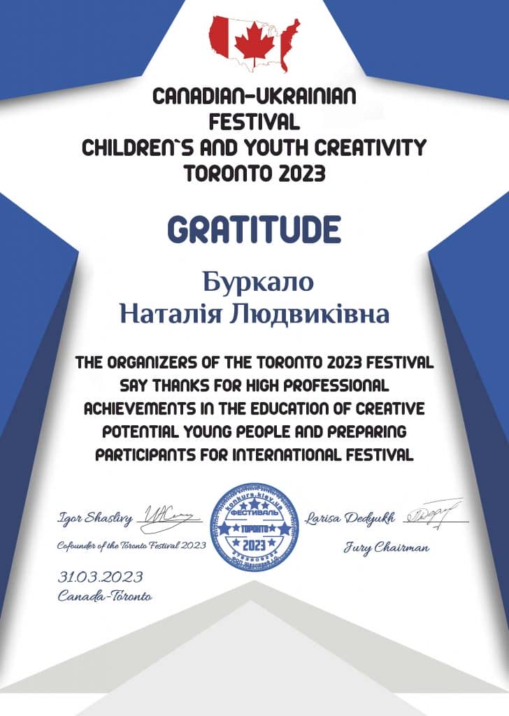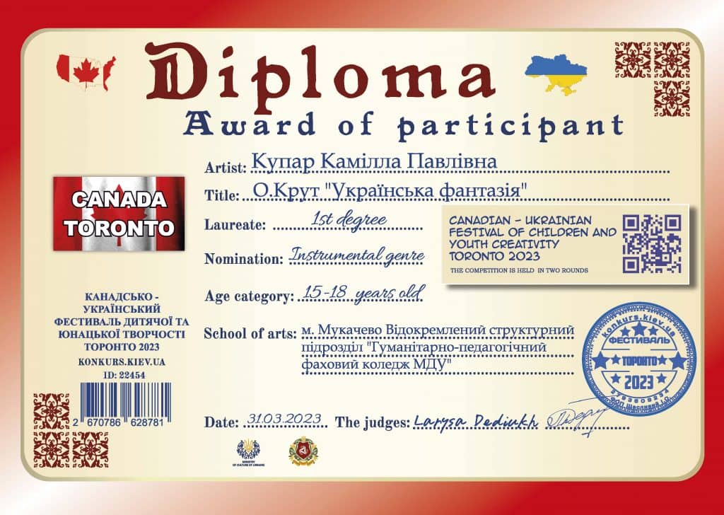 Лауреата І премії Канадсько – Українського фестиваль-конкурсу дитячої та юнацької творчості ТОРОНТО 2023 в номінації інструментальний жанр (фортепіано) Купар Каміллу здобувача освіти ІІ курсу музичного відділення та викладача основного музичного інструменту Буркало Наталію Людвиківну з перемогою!