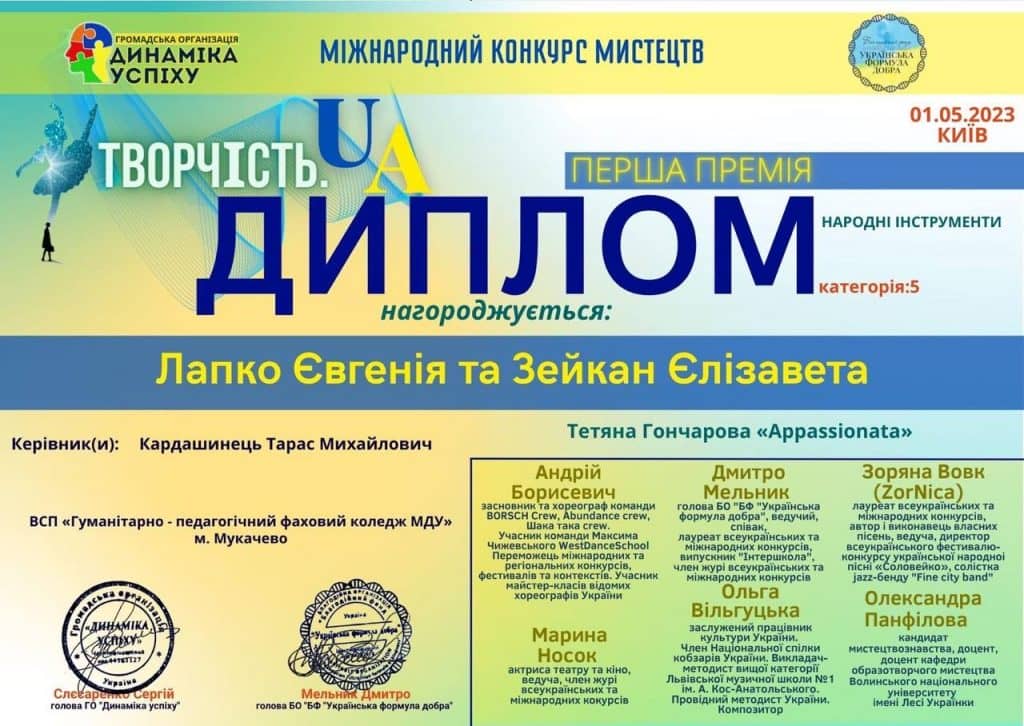 01 травня 2023 року відбувся Міжнародний конкурс мистецтв « Творчість UA» м. Київ, на якому студенти музичного відділення ВСП «ГПФК МДУ» вибороли почесну нагороду.