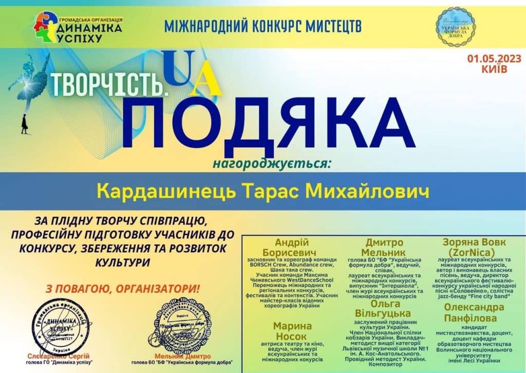Подяку від організаторів та журі Міжнародного конкурсу мистецтв за професіоналізм у підготовці учасників отримав викладач Кардашинець Тарас Михайлович.