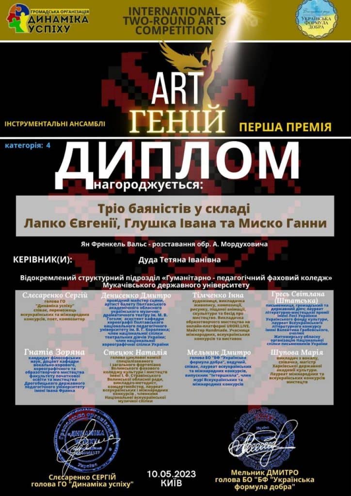 10 травня 2023 року відбувся Міжнародний конкурс мистецтв «АРТ ГЕНІЙ» м. Київ, на якому здобувачі освіти музичного відділення ВСП «ГПФК МДУ» вибороли почесну нагороду. Дипломом Лауреатів І премії в номінації інструментальні ансамблі нагороджені здобувачі освіти ІV-го курсу учасники тріо баяністів Лапко Євгенія, Глушко Іван та Миско Ганна!