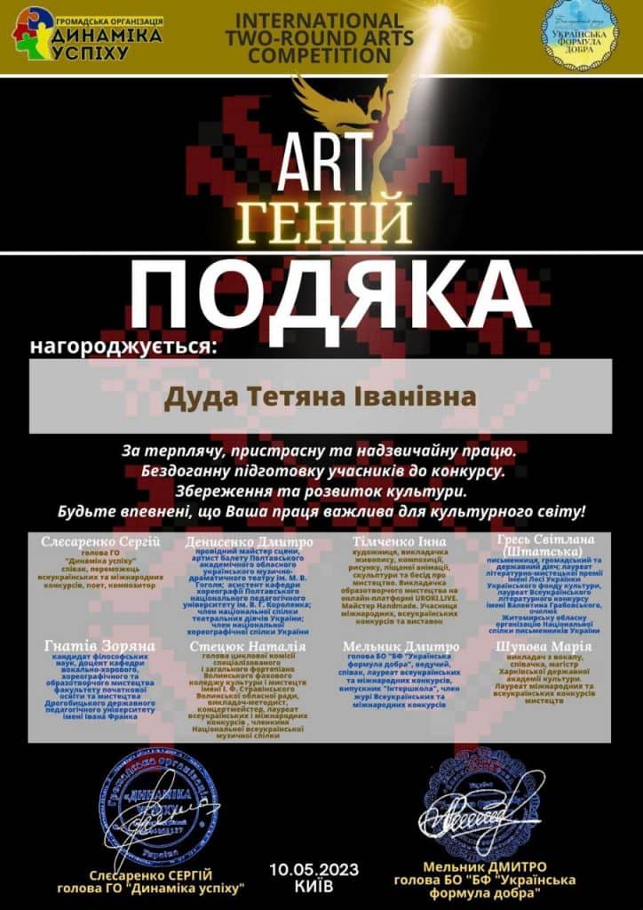 Подяку від організаторів та журі Міжнародного конкурсу мистецтв за професіоналізм у підготовці учасників отримала викладач Дуда Тетяна Іванівна.