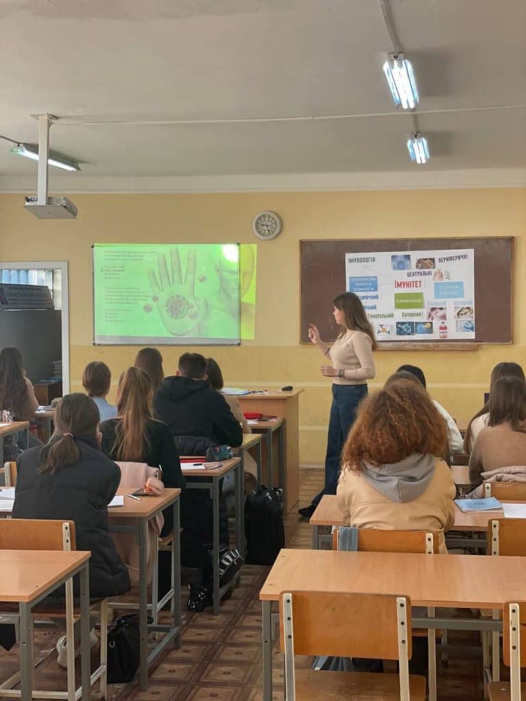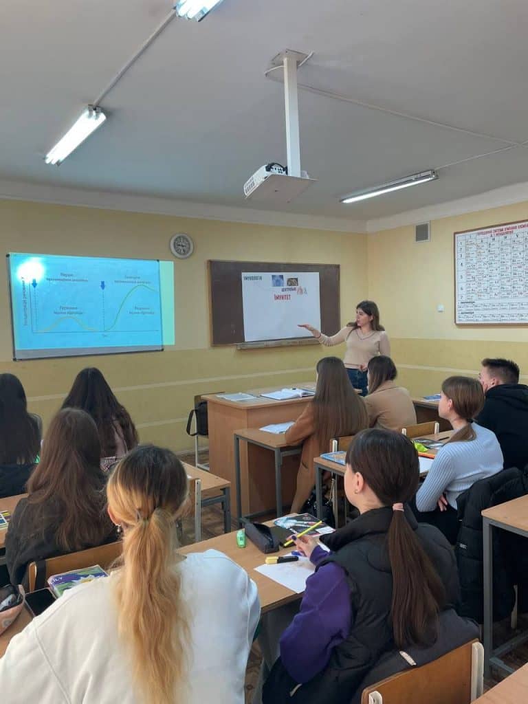 9 листопада 2023 р. викладачем предметної (циклової) комісії викладачів природничих дисциплін, Алмашій Е. В. було проведено відкрите заняття зі здобувачами освіти 2 курсу, групи Б з дисципліни “Біологія та екологія” на тему: “Імунна система людини, особливості її функціонування. Імунокорекція. Імунотерапія.”. Метою заняття було ознайомити здобувачів освіти із поняттями «імунна система», «імунітет», «специфічний» і «неспецифічний», «клітинний» і «гуморальний» імунітет; сформувати уявлення про імунну регуляцію функцій організму, органи, що беруть участь у забезпеченні імунітету, імунні реакції організму; розвивати увагу, пам’ять, мислення, уміння порівнювати, аналізувати, систематизувати та узагальнювати інформацію; виховувати дбайливе ставлення до власного здоров’я, прагнення вести здоровий спосіб життя, формувати повагу до життя як найвищої цінності.