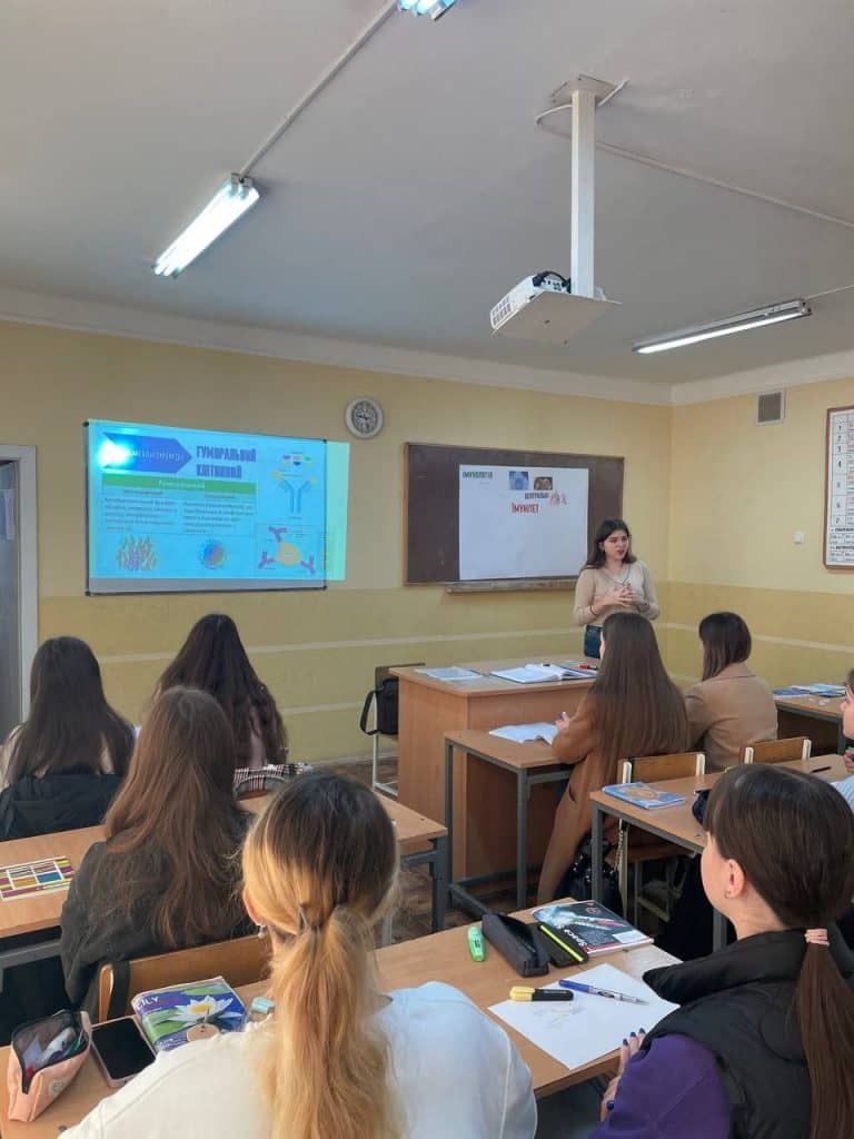 9 листопада 2023 р. викладачем предметної (циклової) комісії викладачів природничих дисциплін, Алмашій Е. В. було проведено відкрите заняття зі здобувачами освіти 2 курсу, групи Б з дисципліни “Біологія та екологія” на тему: “Імунна система людини, особливості її функціонування. Імунокорекція. Імунотерапія.”. Метою заняття було ознайомити здобувачів освіти із поняттями «імунна система», «імунітет», «специфічний» і «неспецифічний», «клітинний» і «гуморальний» імунітет; сформувати уявлення про імунну регуляцію функцій організму, органи, що беруть участь у забезпеченні імунітету, імунні реакції організму; розвивати увагу, пам’ять, мислення, уміння порівнювати, аналізувати, систематизувати та узагальнювати інформацію; виховувати дбайливе ставлення до власного здоров’я, прагнення вести здоровий спосіб життя, формувати повагу до життя як найвищої цінності.