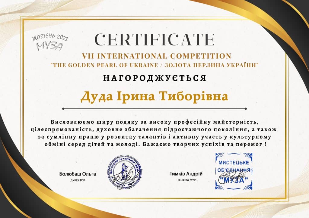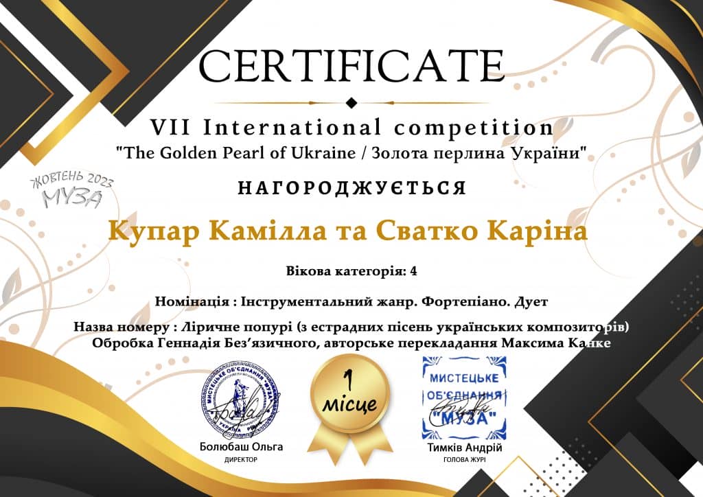 Здобувачі освіти ІІІ-В курсу Купар Камілла та Сватко Каріна вибороли перемогу І місце на Міжнародному багатожанровому конкурсі «Золота перлина України» в номінації: Інструментальний жанр. Фортепіано. Дует.