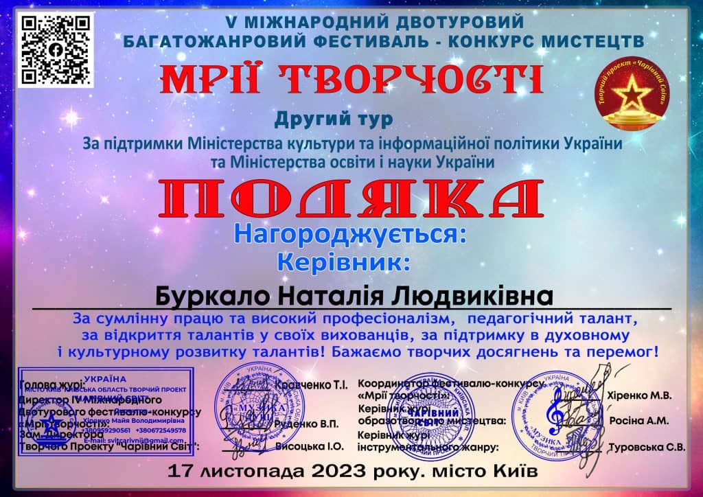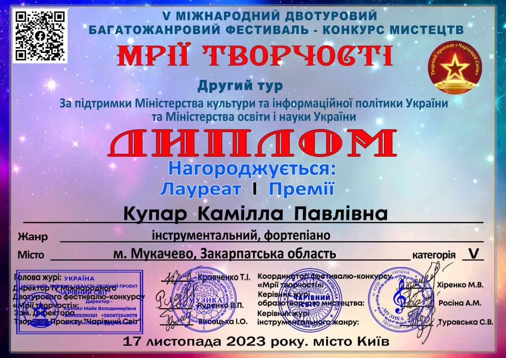 Лауреата І премії V Міжнародного фестиваль-конкурсу «Мрії творчості» 2023 в номінації інструментальний жанр (фортепіано) Купар Каміллу здобувача освіти ІІІ курсу музичного відділення та викладача основного музичного інструменту Буркало Наталію Людвиківну з перемогою!