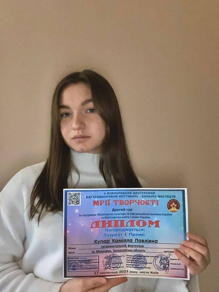 Лауреата І премії V Міжнародного фестиваль-конкурсу «Мрії творчості» 2023 в номінації інструментальний жанр (фортепіано) Купар Каміллу здобувача освіти ІІІ курсу музичного відділення та викладача основного музичного інструменту Буркало Наталію Людвиківну з перемогою!
