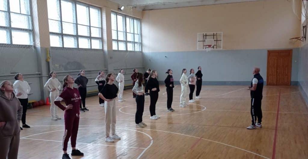 У процесі реалізації мети заняття здобувачі освіти ознайомилися з основними елементами баскетболу, навчалися і вдосконалювали ведення та передачі м’ яча. Під час проведення естафети з елементами баскетболу викладач сприяв розвитку в здобувачів освіти фізичних якостей (швидкість, спритність, сила), виховував дисципліну, організовану роботу на уроці.
