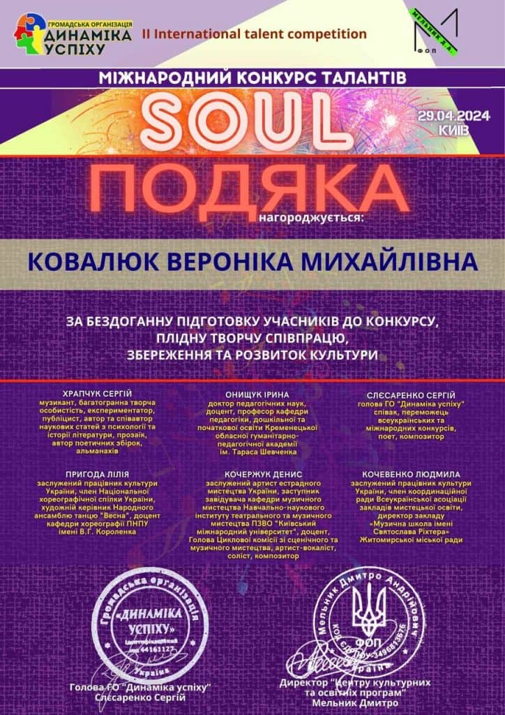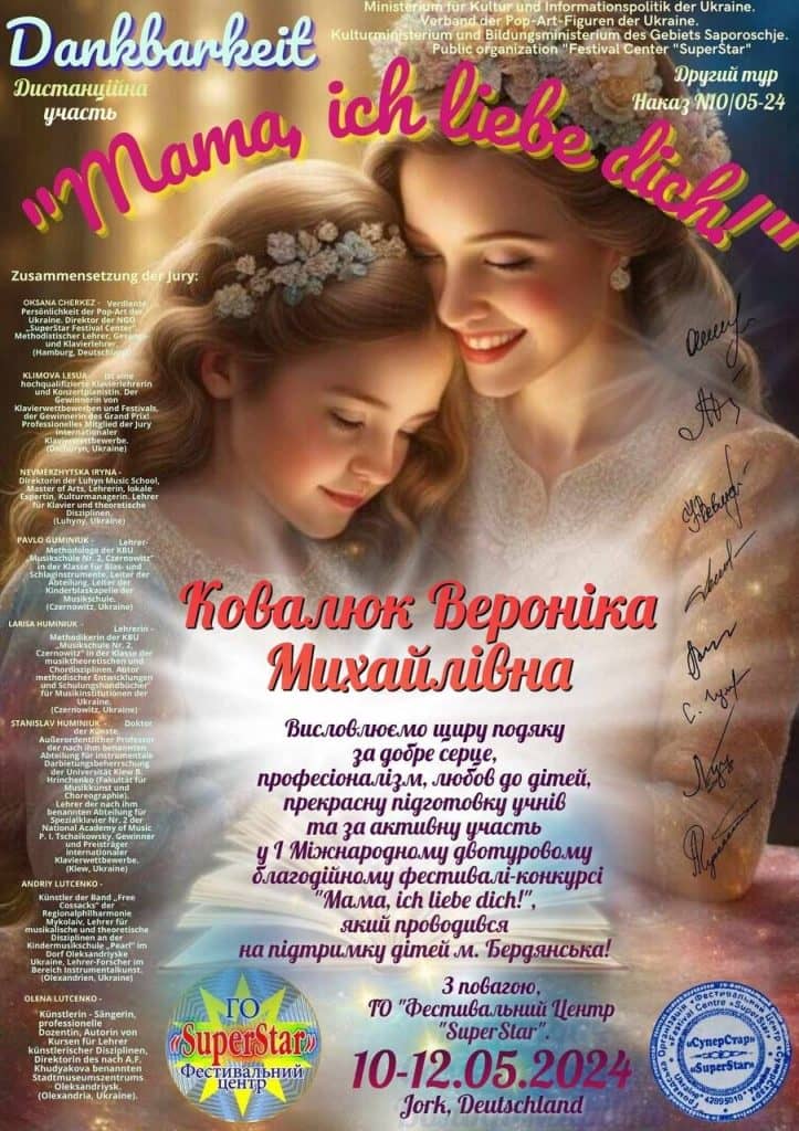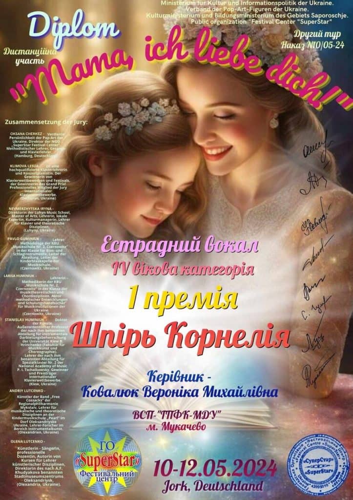 - Міжнародного фестивалю-конкурсу “Mama, ich liebe dich” – І премія в номінації “Естрадний вокал” клас викладача постановки голосу Ковалюк Вероніки Михайлівни! Бажаємо творчих успіхів!
