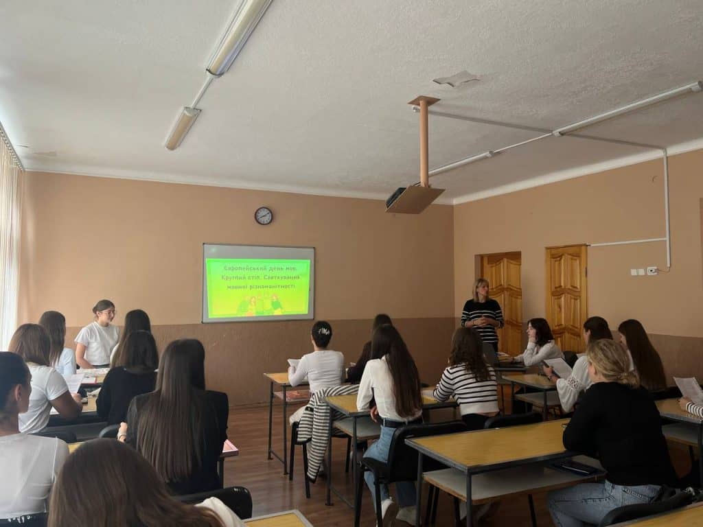 Вже традиційно 26 вересня в коледжі відбуваюсься заходи з нагоди цього свята. Цьогоріч з ініціативи здобувачів освіти третіх курсів груп Г та Н (керівники Маряна Гала та Наталія Фийса) було організовано круглий стіл « Святкування мовного різноманіття». В ході заходу наголошувалося на тому, що глобалізація та розвиток бізнесу означають, що громадяни все частіше потребують знань іноземної мови для ефективної роботи в своїх країнах. Самої англійської мови вже недостатньо. Ще ніколи не було більше можливостей працювати або вчитися в іншій європейській країні, але відсутність мовної компетенції заважає багатьом людям скористатися ними. Здобувачі говорили про те, що ще ніколи не було більше можливостей працювати або вчитися в іншій європейській країні, але відсутність мовної компетенції заважає багатьом людям скористатися ними.
