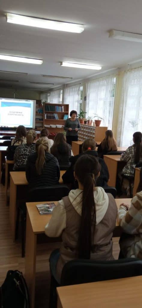 Здобувачі освіти прослухали лекцію від Н.І. Абельчакової, завідувачки бібліотеки коледжу, «Академічна доброчесність в сучасному освітньому просторі». На прикладах студенти отримали пояснення принципів академічної доброчесності, поняття порушень академічної доброчесності та які санкції накладаються на учасників освітнього процесу у разі недотримання принципів АД.