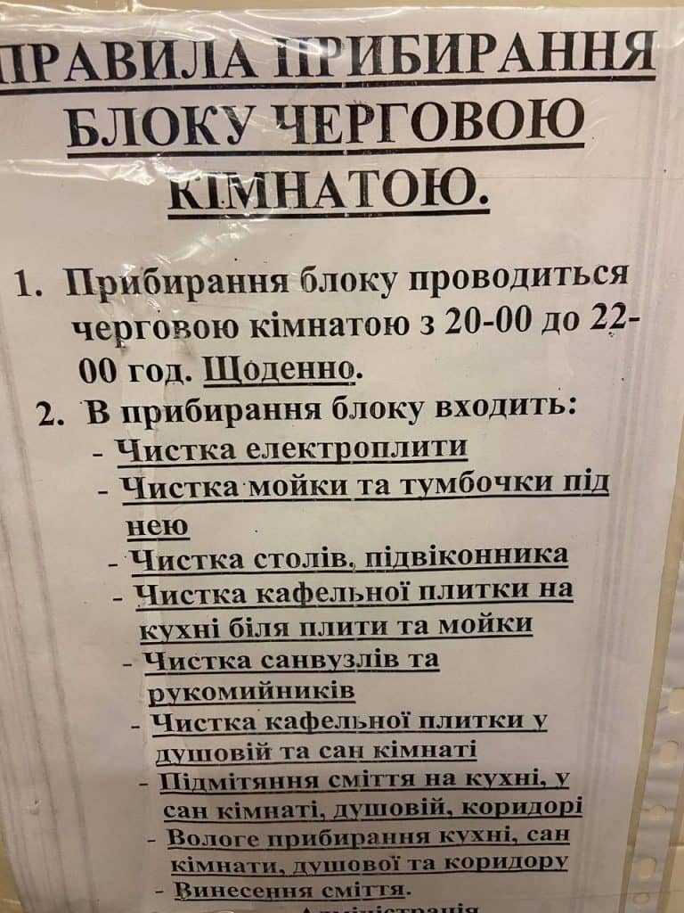 Здобувачі освіти -мешканці гуртожитку ознайомлюються з Правилами внутрішнього розпорядку, проходять інструктажі із техніки безпеки та пожежної безпеки гуртожитку під підпис.
