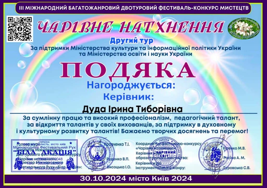 Вітаємо з перемогою здобувачів освіти ІІ та ІV курсу музичного відділення ВСП «ГПФК МДУ» учасників фортепіанного дуету Булгак Дарину та Булгак Яніну, клас викладача  Дуди Ірини Тиборівни зі здобуттям диплому Лауреата І премії в номінації інструментальний жанр фортепіано на ІІI Міжнародному багатожанровому фестиваль-конкурсі мистецтв «Чарівне натхнення» м. Київ, організованого за підтримки Міністерства культури та інформаційної політики України та Міністерства освіти та науки України. Бажаємо подальших успіхів, великих перемог!