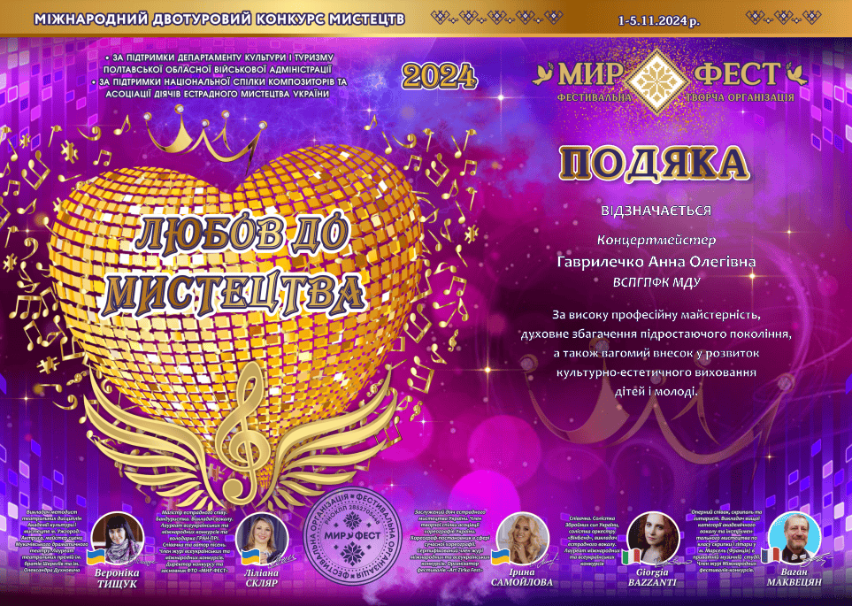 За високу професійну майстерність, духовне збагачення підростаючого покоління, організатори висловили подяку викладачу постановки голосу ВСП “ГПФК МДУ” Небесні Інні Володимирівні та концертмейстеру Гаврилечко Ганні Олегівні. Бажаємо творчих успіхів!
