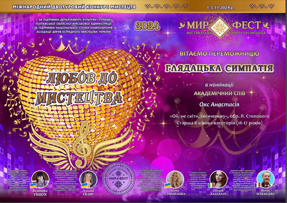 На Міжнародному двотуровому конкурсі мистецтв “ЛЮБОВ ДО МИСТЕЦТВА” здобувачка освіти музичного відділення ВСП “ГПФК МДУ” виборола почесну нагороду. Дипломом Лауреата І премії в номінації “Академічний спів” нагороджена здобувачка освіти ІІІ-го курсу Окс Анастасія!