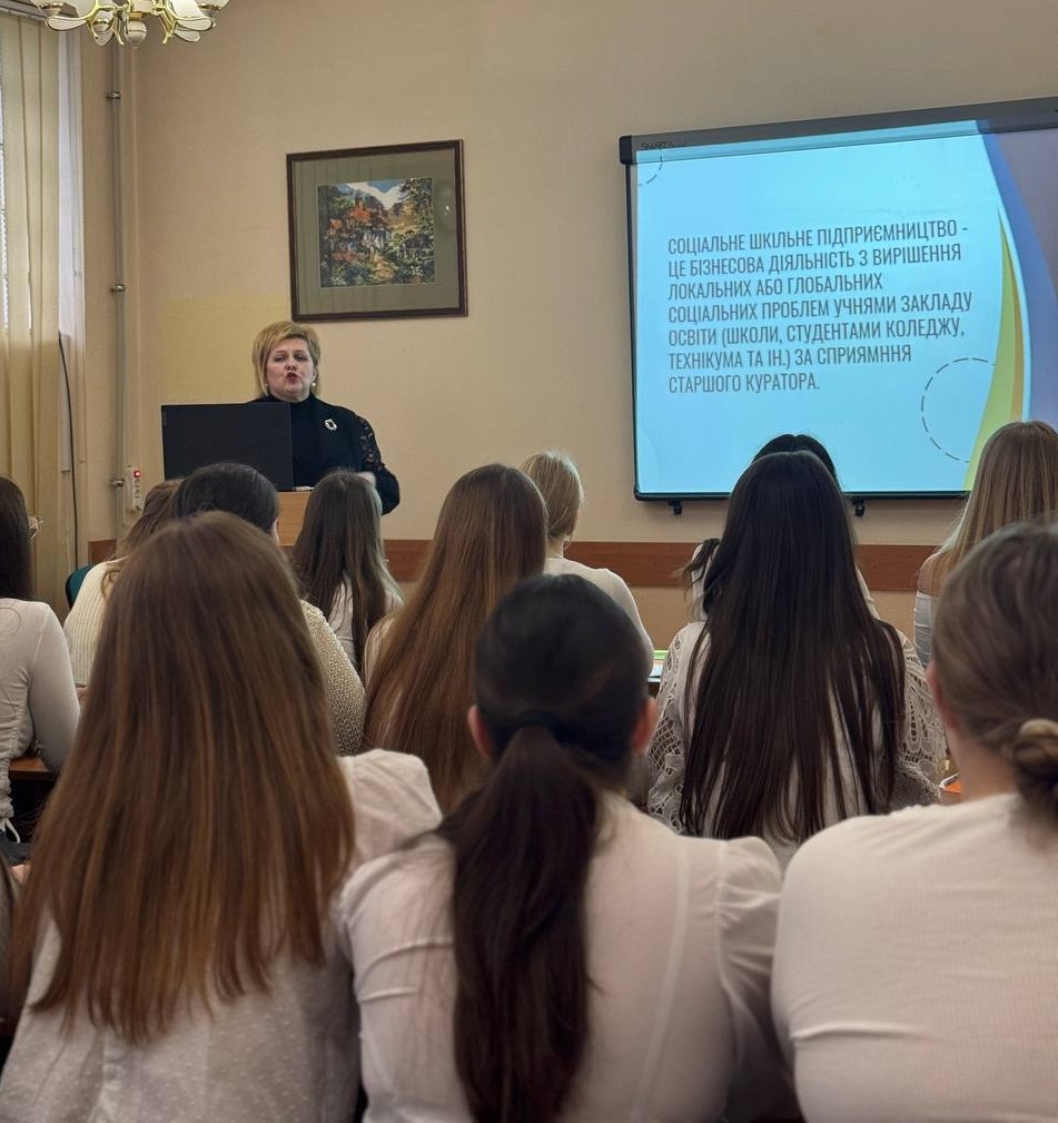 На лекційному занятті викладач провела зі здобувачами освіти інтерактивні вправи «Два-чотири-разом», «Акваріум». Було розглянуто питання: роботи за наймом та підприємництво, соціальне підприємництво, соціальне шкільне підприємництво, лідерський потенціал, діагностика власного лідерського потенціалу, самопрезентація, публічний виступ, промова.