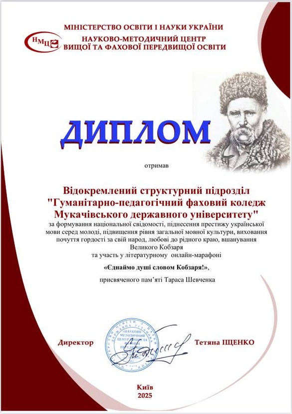 За формування національної свідомості, піднесення престижу української мови серед молоді, підвищення рівня загальної мовної культури, виховання почуття гордості за свій народ, любові до рідного краю, вшанування Великого Кобзаря та участь у літературному онлайн-марафоні «Єднаймо душі словом Кобзаря», присвяченого пам’яті Тараса Шевченка, заклад освіти отримав диплом від Науково-методичного центру вищої та фахової передвищої освіти.