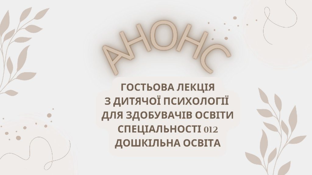 10 квітня 2025 року відбудеться гостьова лекція у рамках вивчення дисципліни «Дитяча психологія» на тему: «Особливості прояву темпераменту і характеру в дітей дошкільного віку» для здобувачів освіти третього курсу, спеціальності 012 Дошкільна освіта.