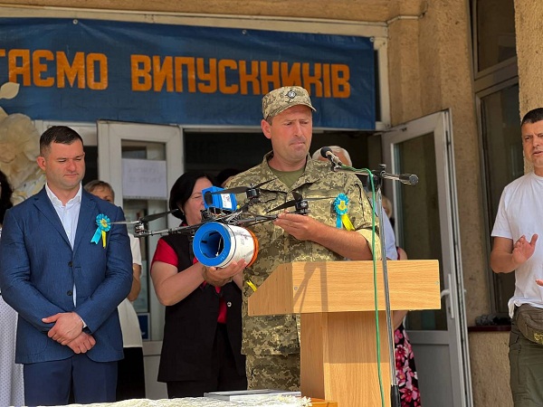 Іванка Томаш, голова студентської ради ВСП «ГПФК МДУ» від імені випускників 2025 року, за сприяння команди проєкту «Мукачівські дрони» Максима Адаменка, передала військовослужбовцю 128-ї гірсько-штурмової бригади Пиринцю Михайлу Михайловичу дрон.