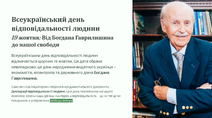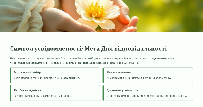 Під час вступної частини куратор розповіла про історію започаткування Дня відповідальності людини та постать Богдана Гаврилишина — видатного українця, економіста та філантропа, співзасновника Всесвітнього економічного форуму в Давосі, ініціатора створення Декларації відповідальності людини. Студенти дізналися, що цей документ складається з 15 пунктів і закликає кожного діяти чесно, гідно й свідомо — у ставленні до себе, до інших людей, до суспільства й природи.