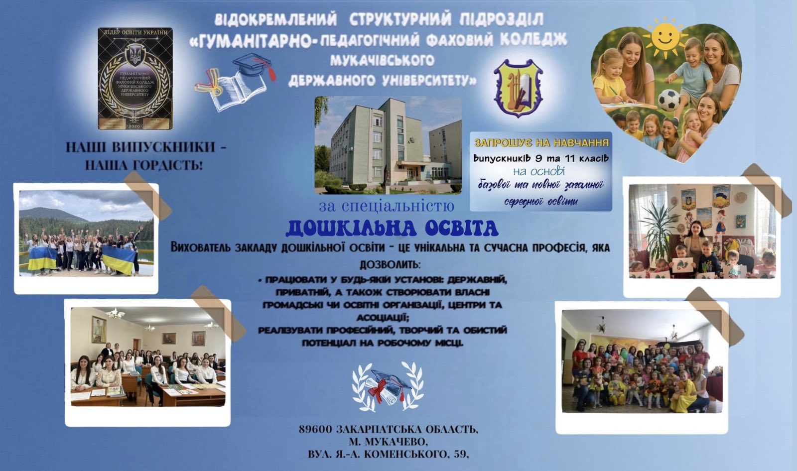 Основні переваги: можливість постійно бути в тонусі (фізичному, психологічному, інтелектуальному) мати гарний настрій, бути цікавим для малих «Чомусиків»; можливість відкривати в собі щось нове і світ для малюків – постійно вдосконалюючись, вчити дітей; будувати кар’єру в галузі дошкільної освіти; продовжувати навчання в Мукачівському державному університеті.