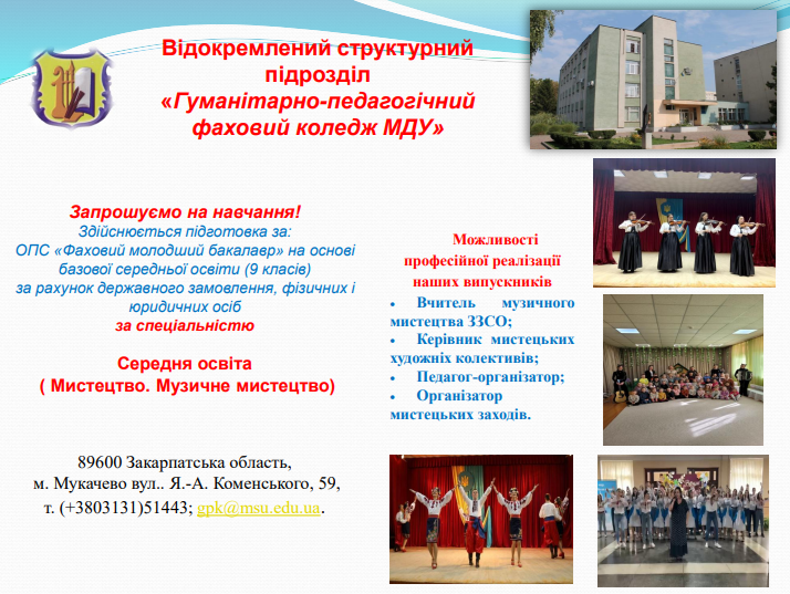 Наші переваги: навчання за державним замовленням; якісний науково-педагогічний склад викладачів; можливість реалізувати свої творчі здібності в народних та художніх колективах коледжу, які відзначаються жанровою різноманітністю, виконавською майстерністю; проходження педагогічної практики у кращих закладах загальної середньої освіти та дошкільних навчальних закладах освіти міста Мукачева.