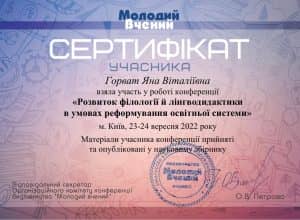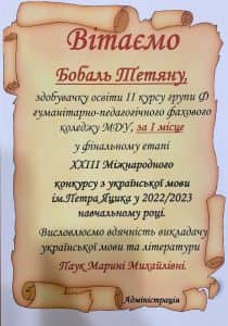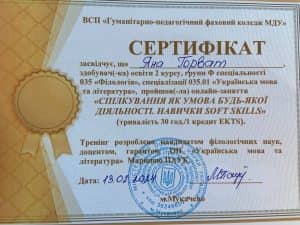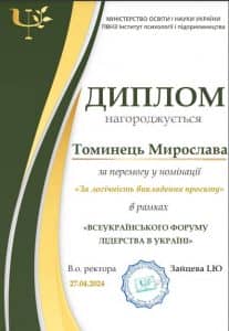Випускники спеціальності 035.01 «Українська мова та література» стали переможцями Всеукраїнського форуму лідерства в Україні, проведеного ПВНЗ «Інститутом психології і підприємництва», нагороджені сертифікатами переможців та грошовими грантами: Барановська Оксана, проєкт літературна студія «Майстерні слова», Бобаль Тетяна – проєкт «Створення «ідеалу себе» через прагнення до успіху», Томинець Мирослава – проєкт «Безпекового простору «Inclusion without bullying»».